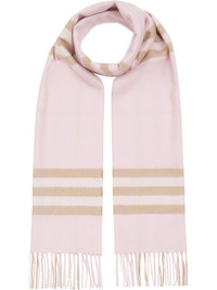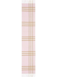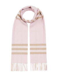 classic checked scarf A quintessentially British brand, Burberry creates iconic designs that seamlessly infuse their rich heritage with a contemporary aesthetic. This pink cashmere classic checked scarf features a long length, a striped pattern, and tassel detailing. This item is unisex. Made in United Kingdom Composition Cashmere 100% SIZE & FIT Measurement LENGTH 66.14 in(168 cm) WIDTH 11.81 in(30 cm) Washing instructions Dry Clean Only