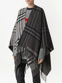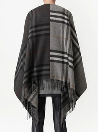contrast check cape Part of Burberry's AW22 collection, this Scottish-made cape in soft wool cashmere is decorated with jacquard-woven with contrasting checks. This model features a logo motif on the sides and is finished with a fringed edge. Highlights - Grey - Wool-cashmere blend - Check pattern - Open front - Fringed edge Made in United Kingdom Composition Wool 51%, Cashmere 49%