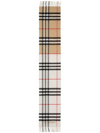 contrast-check cashmere scarf Burberry presents its iconic Vintage Check in complementary beige and white panels on this scarf, offering a subtle twist on their signature design. Highlights - Multicolour - Cashmere - Vintage check pattern - Intarsia-knit logo - Panelled design - Fringed edge Made in United Kingdom Composition Cashmere 100%