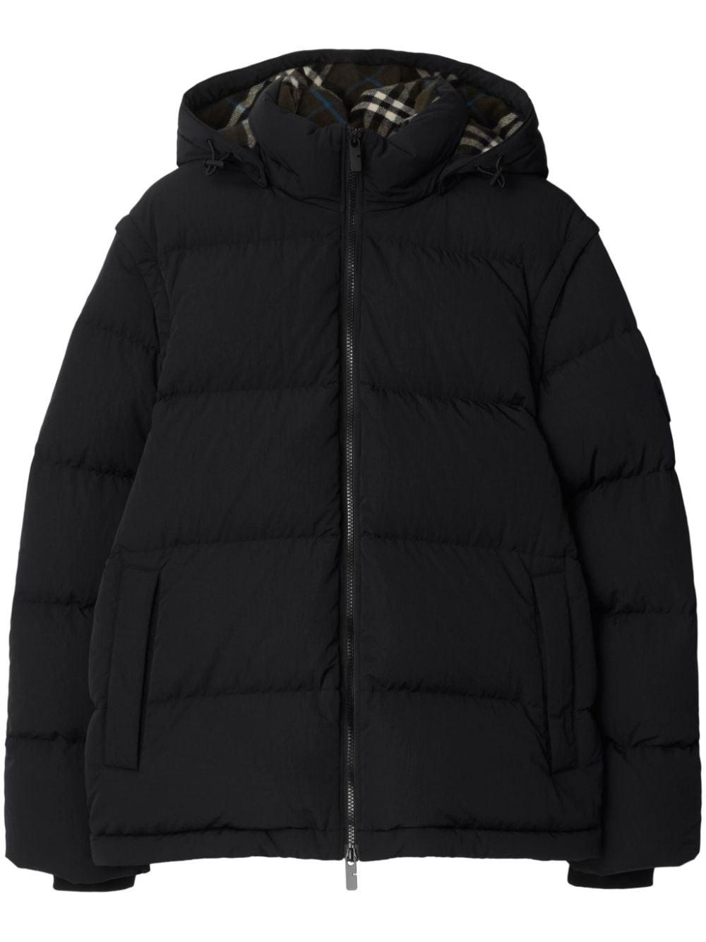 detachable-sleeve padded jacket Highlights - Black - Goose down - Detachable sleeves - Padded design - Front two-way zip fastening - Slouchy drawstring hood - Stand-up collar - Logo patch at the sleeve - Two side zip-fastening pockets - Drawstring hem - Checked lining Imported Composition Lining: Polyester 100%, Polyamide 100%, Goose Down 90%, Goose Feather 10% Outer: Polyamide 100% Washing instructions Machine Wash