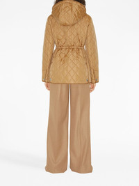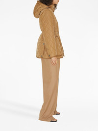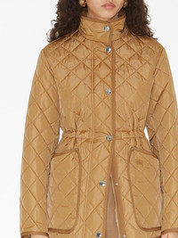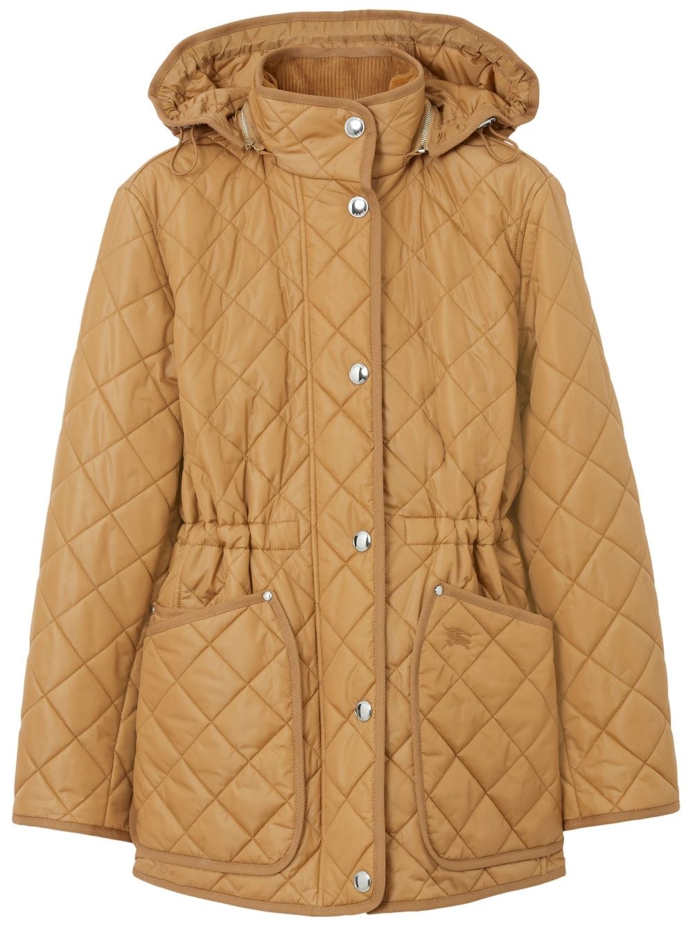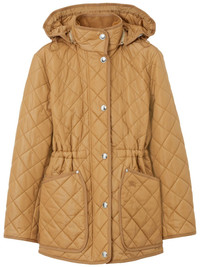 diamond-quilted hooded jacket Presented in the signature archive beige colourway, this jacket by Burberry is defined by a diamond-quilted construction accented with a discreet EKD embroidery. Featuring a concealed front fastening with a drawstring waist, it benefits from two patch pockets and a detachable hood for convenience. Highlights - Archive beige - Diamond quilting - Funnel neck - Detachable drawstring hood - Concealed front zip fastening - Long sleeves - Drawstring waist - Two front patch pockets - Signature equestrian knight motif - Curved hem Imported Composition Outer: Polyamide 100% Lining: Polyester 100%