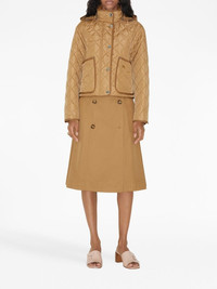 diamond-quilted hooded jacket Presented in the signature archive beige colourway, this jacket by Burberry is defined by a diamond-quilted construction accented with a discreet EKD embroidery. Featuring a concealed front fastening, it benefits from two patch pockets and a detachable hood for convenience. Highlights - Archive beige - Diamond quilting - Funnel neck - Detachable drawstring hood - Concealed front zip fastening - Long sleeves - Two front patch pockets - Signature equestrian knight motif - Straight hem Imported Composition Outer: Polyamide 100% Lining: Polyester 100% SIZE & FIT Measurement SLEEVE LENGTH 17.32 in(44 cm) LENGTH 20.07 in(51 cm) WAIST 40.94 in(104 cm) BUST 39.37 in(100 cm)