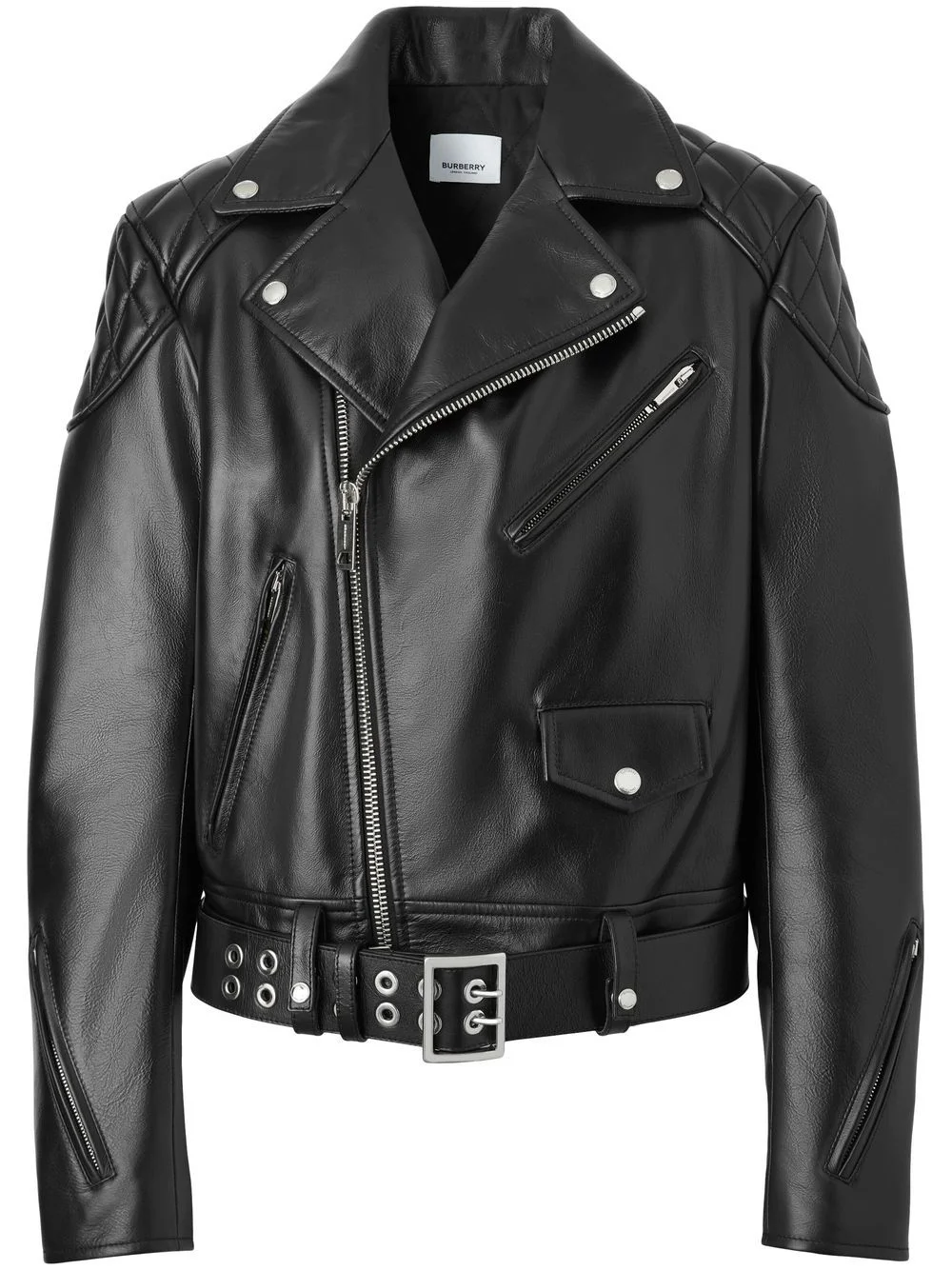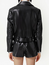 diamond quilted-panel biker jacket black calf leather diamond quilting press-stud fastening collar off-centre front zip fastening cuff zips belted waist full lining Made in Italy Composition Outer: Calf Leather 100% Lining: Cupro 100% Washing instructions Specialist Cleaning