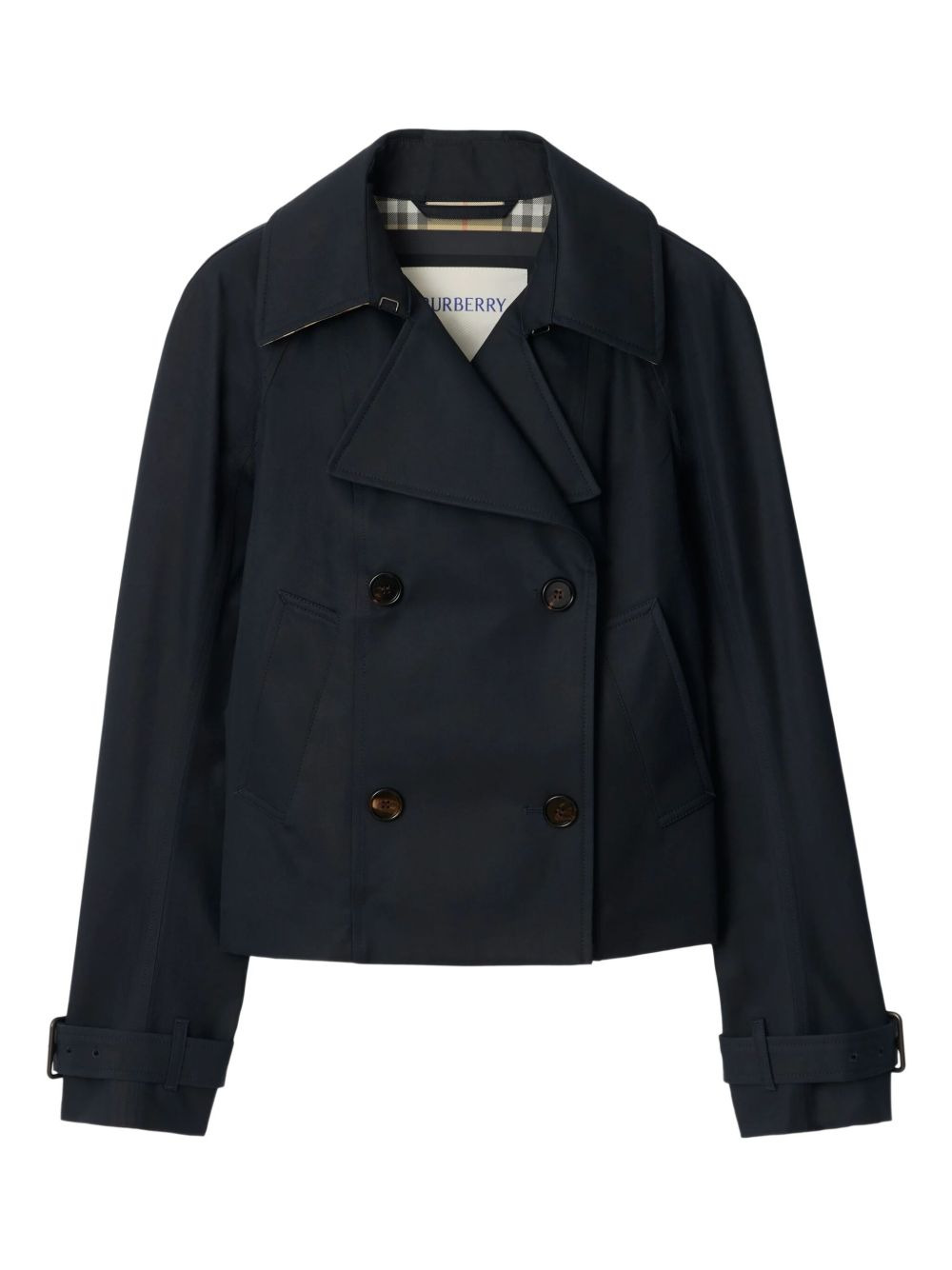 double-breasted belted cropped jacket Highlights - Navy blue - Double-breasted fastening - Belted cuffs - Side welt-pockets - Hook-fastening collar - Notched lapel Imported Composition Fabric 100% Washing instructions Read Manufacturer Guidelines