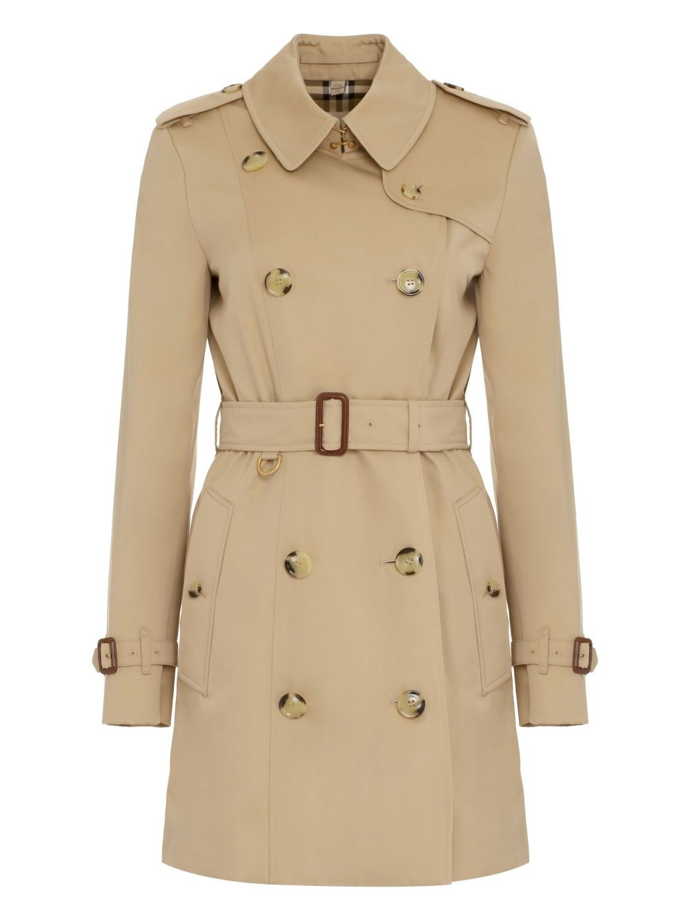 double-breasted trench coat Since its inception in the 1920s, Burberry's iconic Check has been used as a lining in its trench coats for a timeless feel. For SS24, the house revisits their original design, showcasing their rich heritage, whilst the exaggerated epaulettes opt for a modernised touch. Highlights - Archive beige - Organic cotton - Twill weave - Classic collar - Front hook fastening - Double-breasted button fastening - Epaulettes - Long sleeves - Belted cuffs - Belt loops - Detachable and adjustable waist belt - Two side button-fastening pockets - Central rear vent - Straight hem - Vintage check-pattern lining Made in United Kingdom Composition Outer: Calf Leather 100%, Organic Cotton 70%, Cotton 30% Lining: Cotton 100%, Viscose 100% SIZE & FIT FittingInformation Designed to be unstructured, offering a loose fit throughout The belt offers adjustability for fitted preferences Made from a midweight non-stretch fabric This piece fits true to size – take your usual size