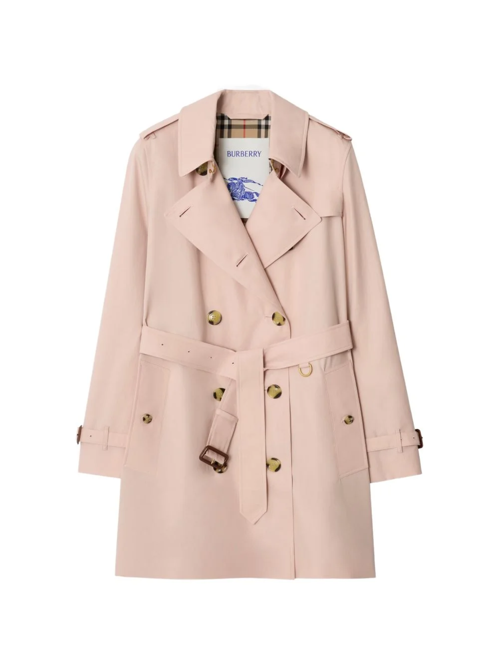 double-breasted trench coat Highlights - Pale pink - Water resistant - Double-breasted button closure - Check undercollar - Buckle belt - Button welt pockets - Storm shield at back Made in United Kingdom Composition Outer: Cotton 100%, Calf Leather 100% Lining: Cotton 100%, Viscose 100% Washing instructions Dry Clean Only