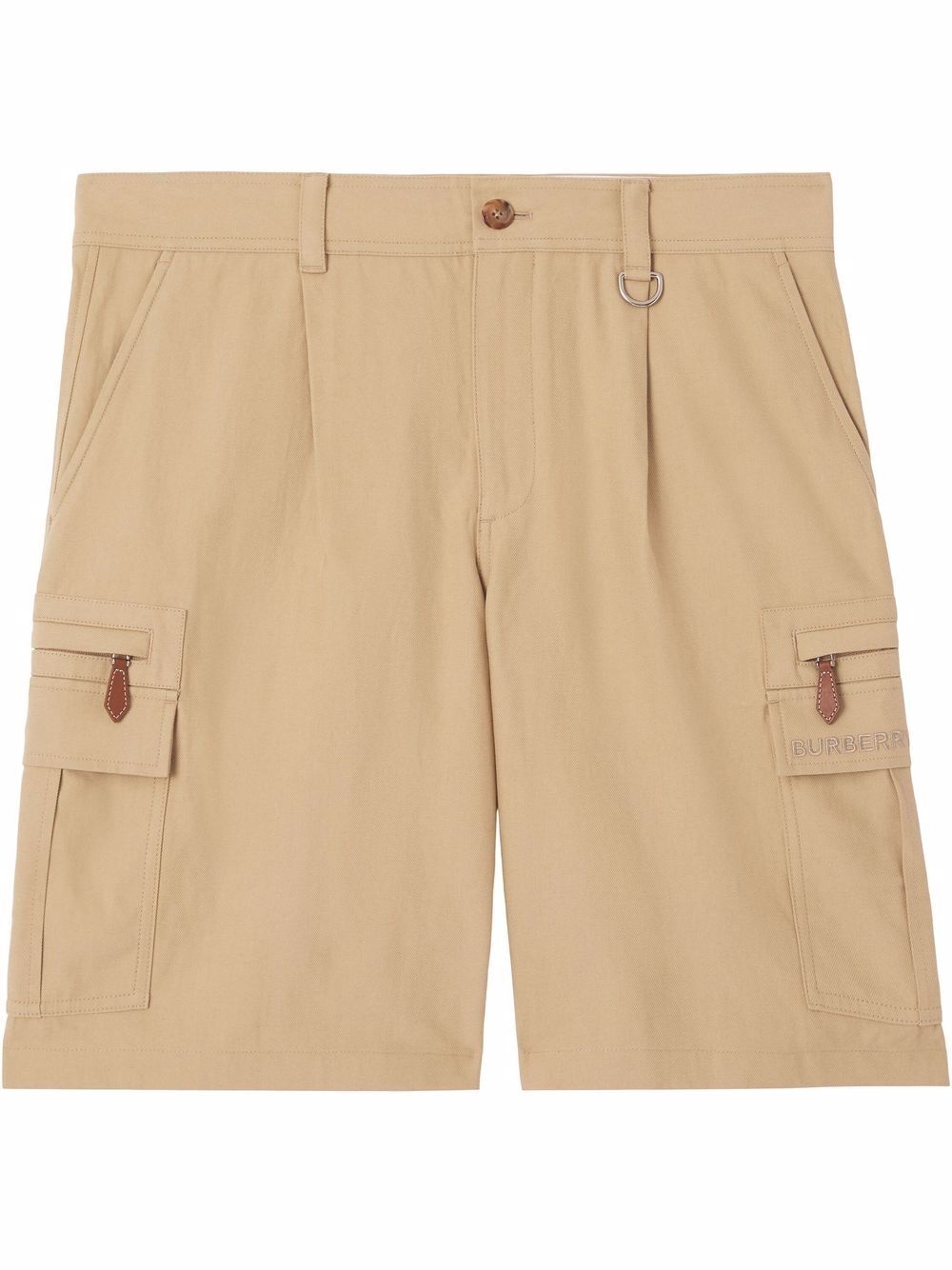 embroidered-logo cargo shorts Crafted from a cotton and linen blend, these cargo shorts from Burberry are presented in a classic fawn-beige hue. The casual design is continued with a timeless straight-leg silhouette. Highlights - Soft fawn brown - Cotton/linen - Embroidered logo to the side - Two side cargo pockets - Mid-rise - Belt loops - Front button and zip fastening - Straight leg - Side zip-fastening pocket - D-ring findings Made in Italy Composition Cotton 82%, Linen/Flax 18% SIZE & FIT Measurement FRONT RISE 12.2 in(31 cm) INSIDE LEG 10.23 in(26 cm)