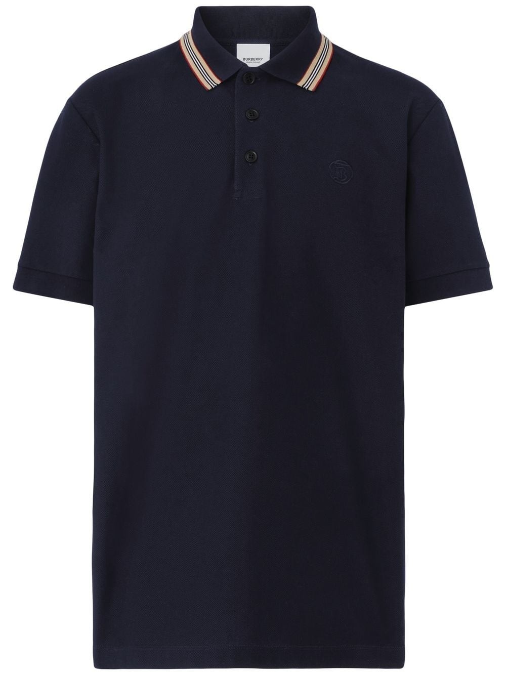 embroidered TB polo shirt A timeless silhouette, this black cotton polo shirt from Burberry is elevated with key house motifs, such as an Icon stripe trim at the collar and a tonal embroidered TB logo at the chest. Highlights - Black - Cotton - Pique weave - Signature tb monogram patch - Polo collar - Front button placket - Short sleeves Imported Composition Trims: Cotton 97%, Elastane 3% Cotton 100% SIZE & FIT Measurement CHEST 38.58 in(98 cm) Washing instructions Machine Wash