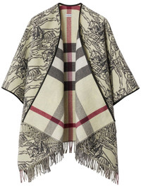 Equestrian Knight fringe wool poncho Highlights - Ecru/multicolour - Wool - Signature equestrian knight motif - Checked lining - Draped design - Open front - Short draped sleeves - Asymmetric hem - Fringed edge Made in Italy Composition Wool 100% Washing instructions Dry Clean Only