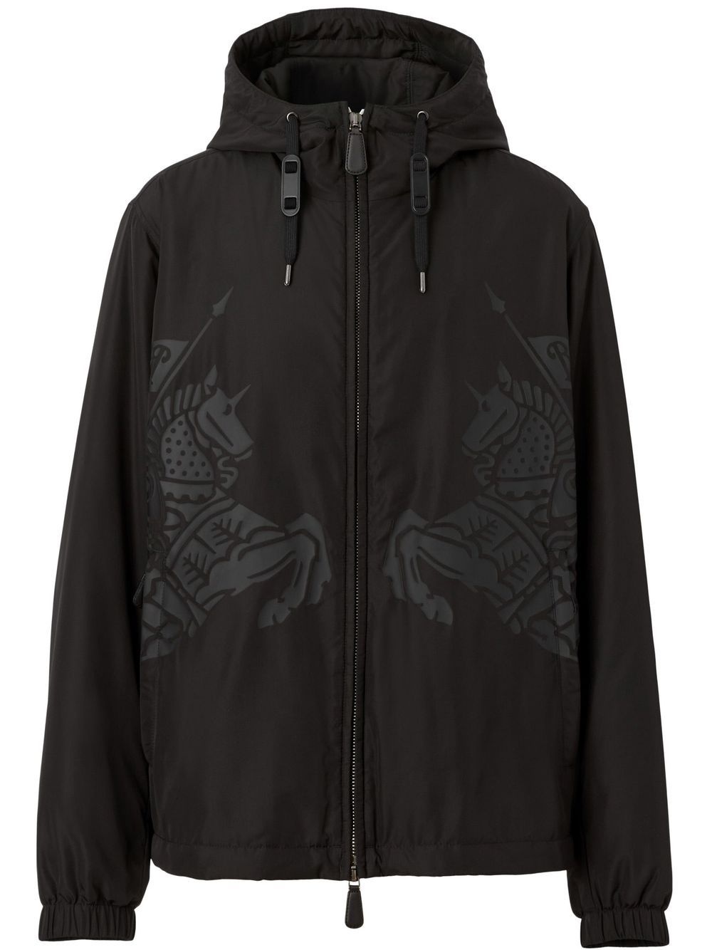 Equestrian Knight printed jacket black tonal design signature Equestrian Knight print to the front drawstring hood front zip fastening long sleeves elasticated cuffs Imported Composition Outer: Polyester 100% Lining: Cupro 100% Filling: Polyester 100%