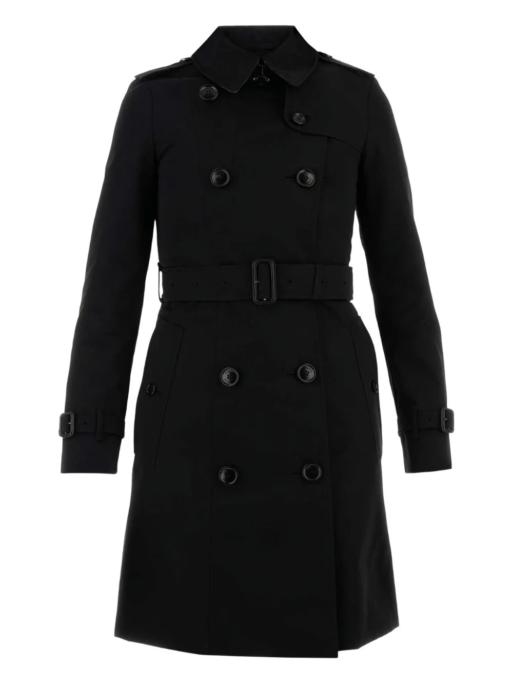 gabardine-weave trench coat Burberry’s black Chelsea trench coat hails from the Heritage collection – an offering that stays true to the founder’s mission ‘to enable people to move freely outdoors.’ It’s cut from water-resistant gabardine with all the hallmarks of the original styles like epaulettes and a D-ring at the belt. Even the Vintage Check lining is the same one that was first used in the ‘20s. Highlights - Black - Gabardine weave - Logo-engraved buttons - Notched lapels - Epaulettes - Long sleeves - Belted cuffs - Belt loops - Detachable and adjustable waist belt - D-ring findings - Two side button-fastening pockets - Storm flap - Buttoned central rear vent - Vintage check-pattern lining - Double-breasted button fastening Made in United Kingdom Composition Lining: Viscose 100%, Cotton 100% Outer: Cotton 100%, Calf Leather 100% SIZE & FIT FittingInformation Designed to be unstructured, offering a loose fit throughout The belt offers adjustability for fitted preferences Made from a midweight non-stretch fabric This piece fits true to size – take your usual size