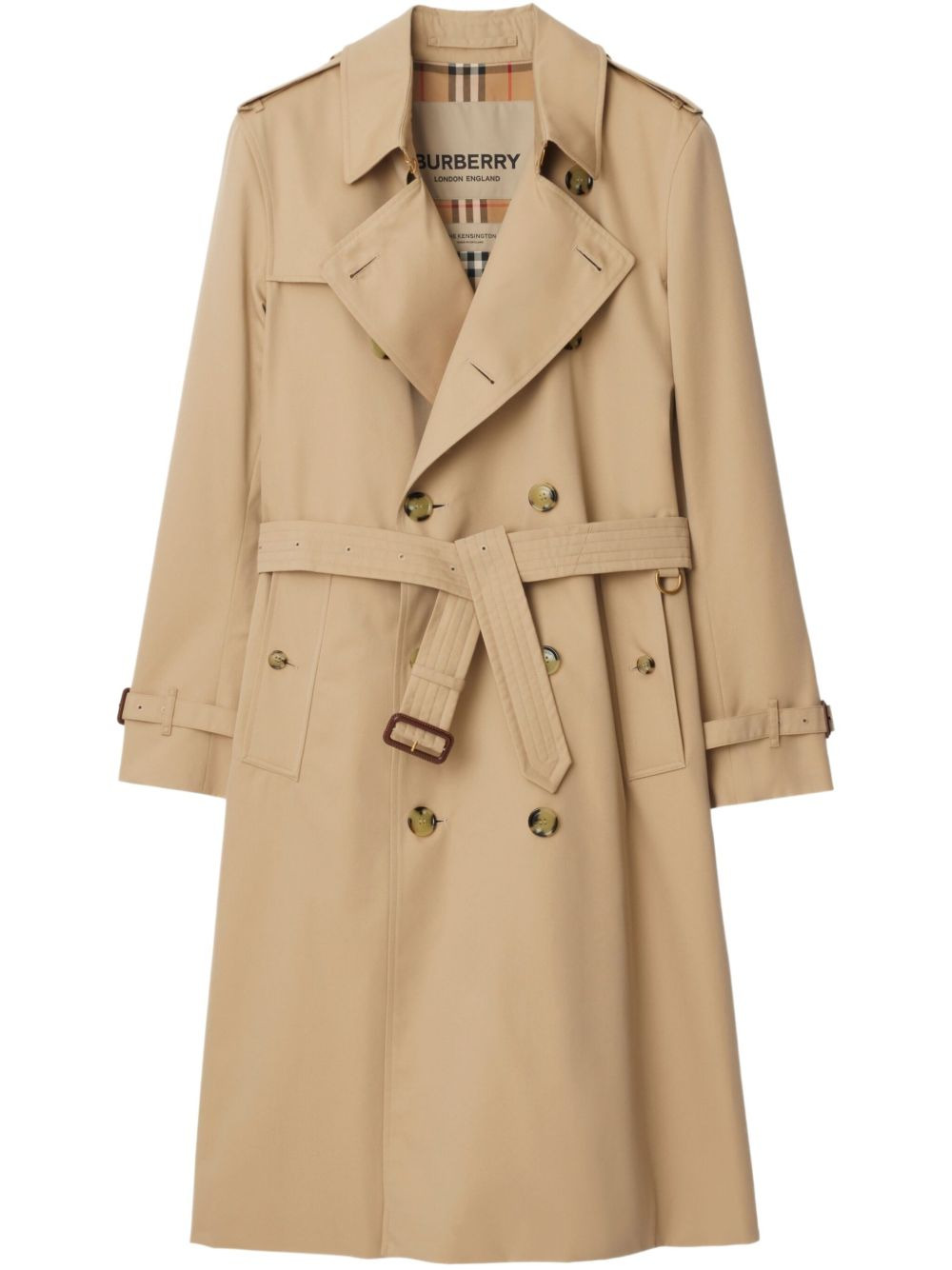 Heritage Kensington belted trench coat Highlights - Archive beige - Cotton - Twill weave - Storm flap - Classic collar - Double-breasted button fastening - Detachable waist belt - Belt loops - Epaulettes - Long sleeves - Belted cuffs - Two front button-fastening jetted pockets - Buttoned central rear vent - Vintage check-pattern lining - Internal slip pocket Made in United Kingdom Composition Lining: Cotton 100%, Viscose 100% Outer: Calf Leather 100%, Organic Cotton 70%, Cotton 30% SIZE & FIT FittingInformation Designed to be unstructured, offering a loose fit throughout The belt offers adjustability for fitted preferences Made from a midweight non-stretch fabric This piece fits true to size – take your usual size