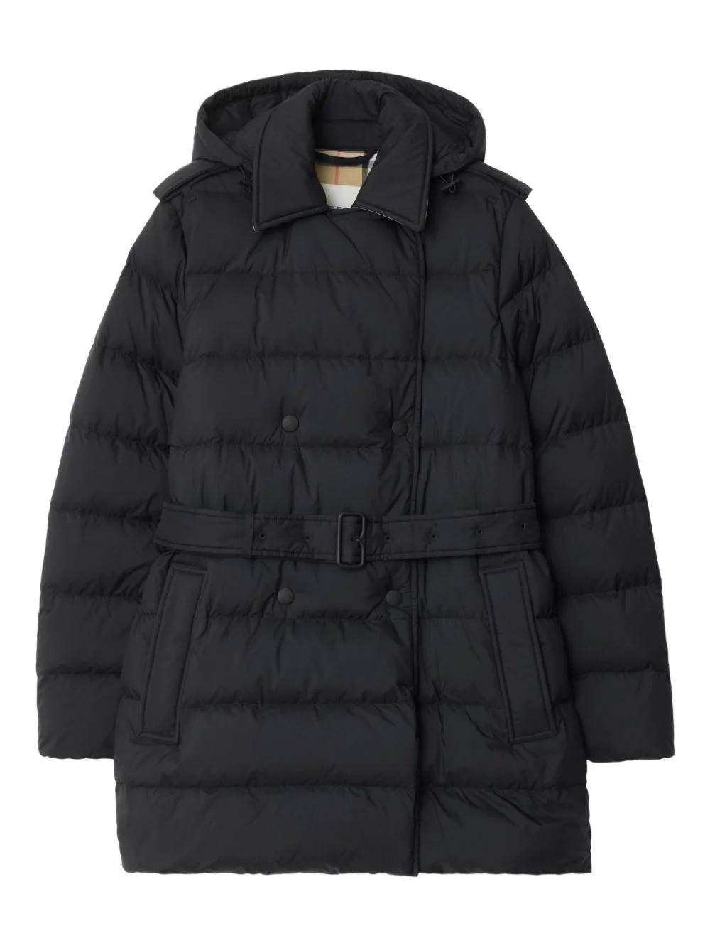 hooded belted puffer jacket Highlights - Black - Detachable drawcord hood - Double-breasted press-stud closure - Belted waist - Epaulettes - Check undercollar Imported Composition Polyamide 100% Washing instructions Read Manufacturer Guidelines