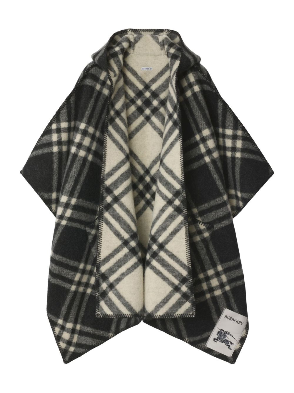hooded check wool cape Highlights - Black - Check pattern - Classic hood - Reversible - Patch pockets - Equestrian knight design label Imported Composition Wool 100% SIZE & FIT Measurement LENGTH 69.29 in(176 cm) WIDTH 47.24 in(120 cm) Washing instructions Specialist Cleaning