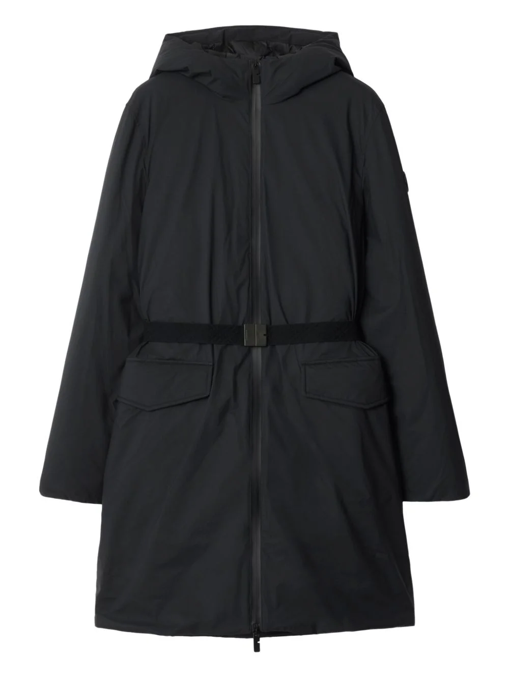 hooded ripstop coat Highlights - Black - Ripstop texture - Leather knight emblem - Elasticated belt - Two way zip closure - Flap pockets - Zip side pockets Imported Composition Polyester 100% Washing instructions Read Manufacturer Guidelines