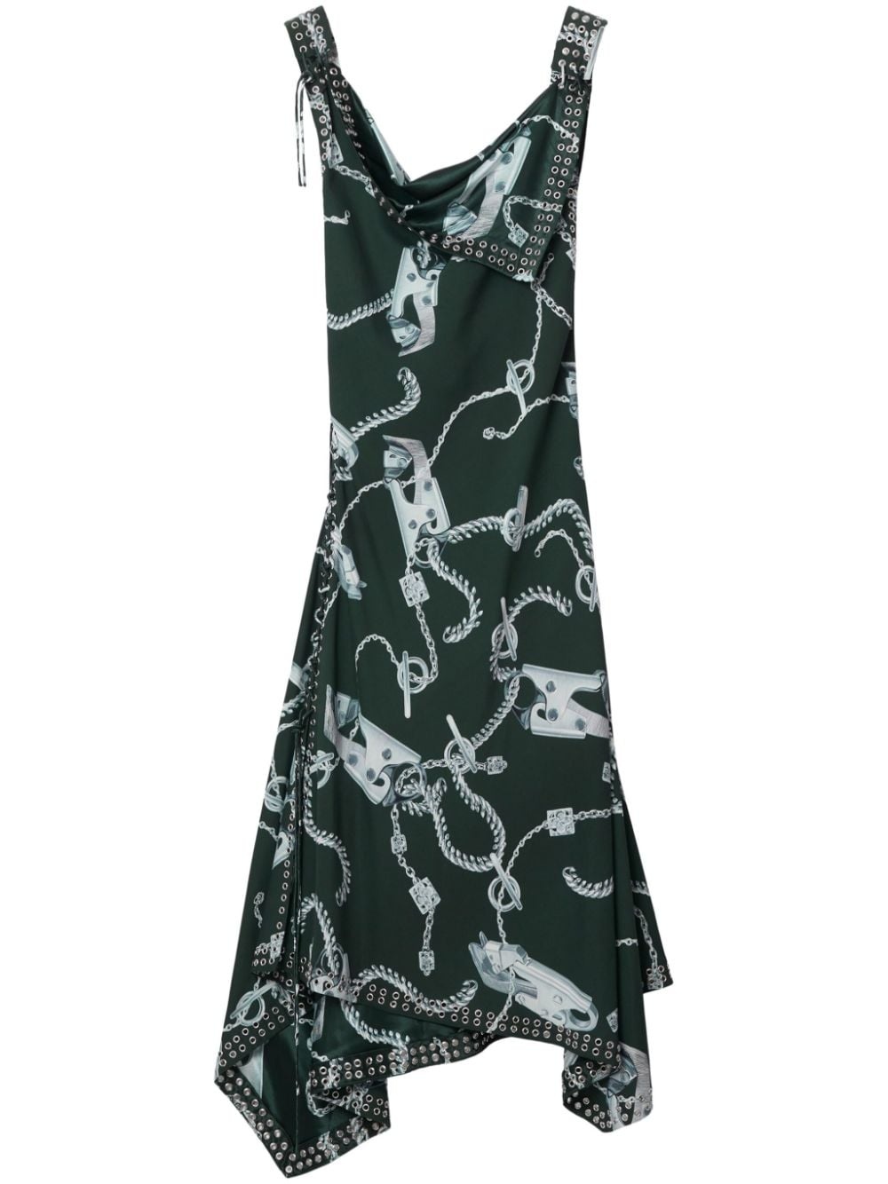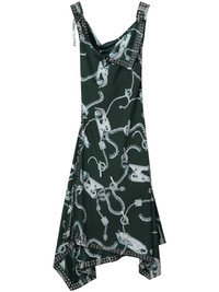 Knight Hardware-print dress Highlights - Black/multicolour - Flared - All-over graphic print - Eyelet embellishment - Cowl neck - Side lace-up fastening - Wide shoulder straps - Asymmetric hem - Mid-length Made in Italy Composition Viscose 100% Washing instructions Dry Clean Only