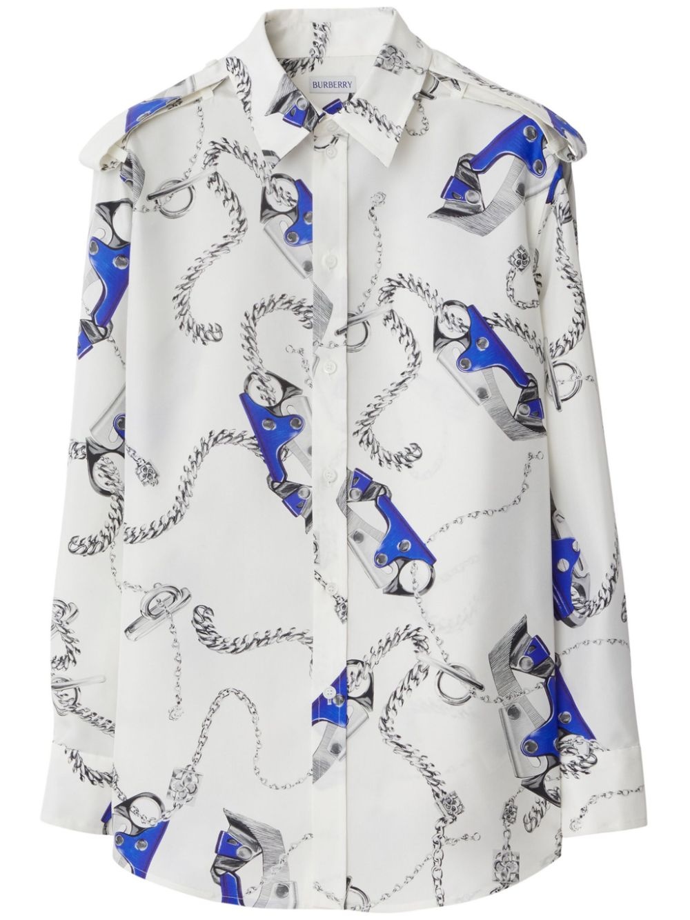 Knight Hardware-print silk shirt Highlights - Blue/white/grey - Silk - Poplin texture - All-over graphic print - Straight-point collar - Epaulettes - Long sleeves - Buttoned cuffs - Curved hem Made in Italy Composition Silk 100%