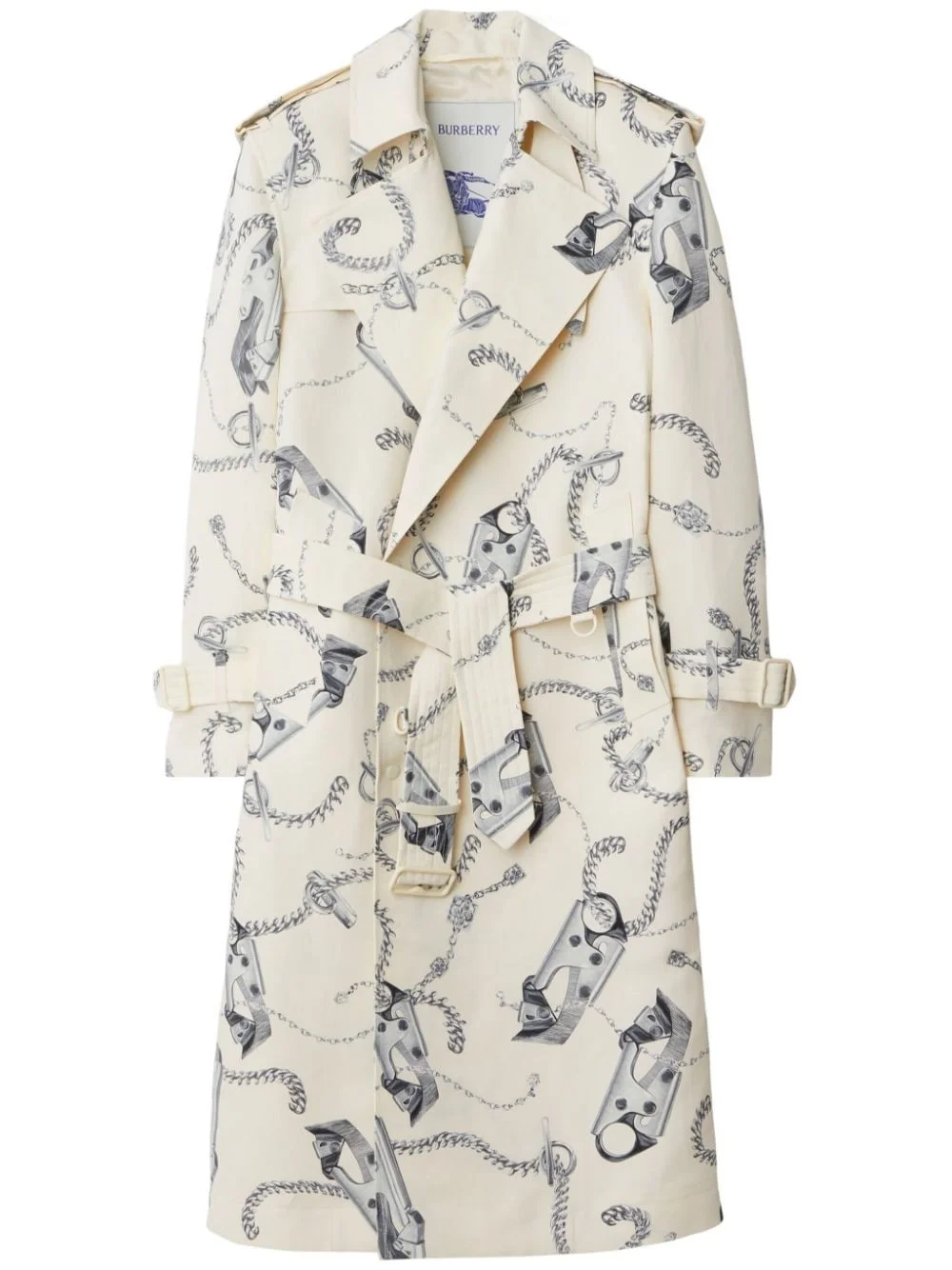 Knight Hardware tricotine trench coat Highlights - Off-white/medium grey - Tricotine - Chain-link print - Notched lapels - Double-breasted press-stud fastening - Storm flap - Epaulettes - Long sleeves - Belted cuffs - Detachable waist belt - Two side welt pockets - Central rear vent - Straight hem Made in Italy Composition Lining: Viscose 100% Outer: Paper 71%, Viscose 29% Washing instructions Dry Clean Only