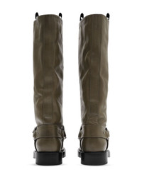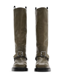 leather knee-high boots Highlights - Moss green - Calf leather - Pull-on style - Knee-high - Double pull-tab at the opening - Buckle-fastening ankle strap - Round toe - Branded leather insole - Flat sole Made in Italy Composition Lining: Calf Leather 96%, Polyester 3%, Polyurethane 1% Outer: Calf Leather 99%, Polyester 1% Sole: Calf Leather 70%, Thermoplastic 30%
