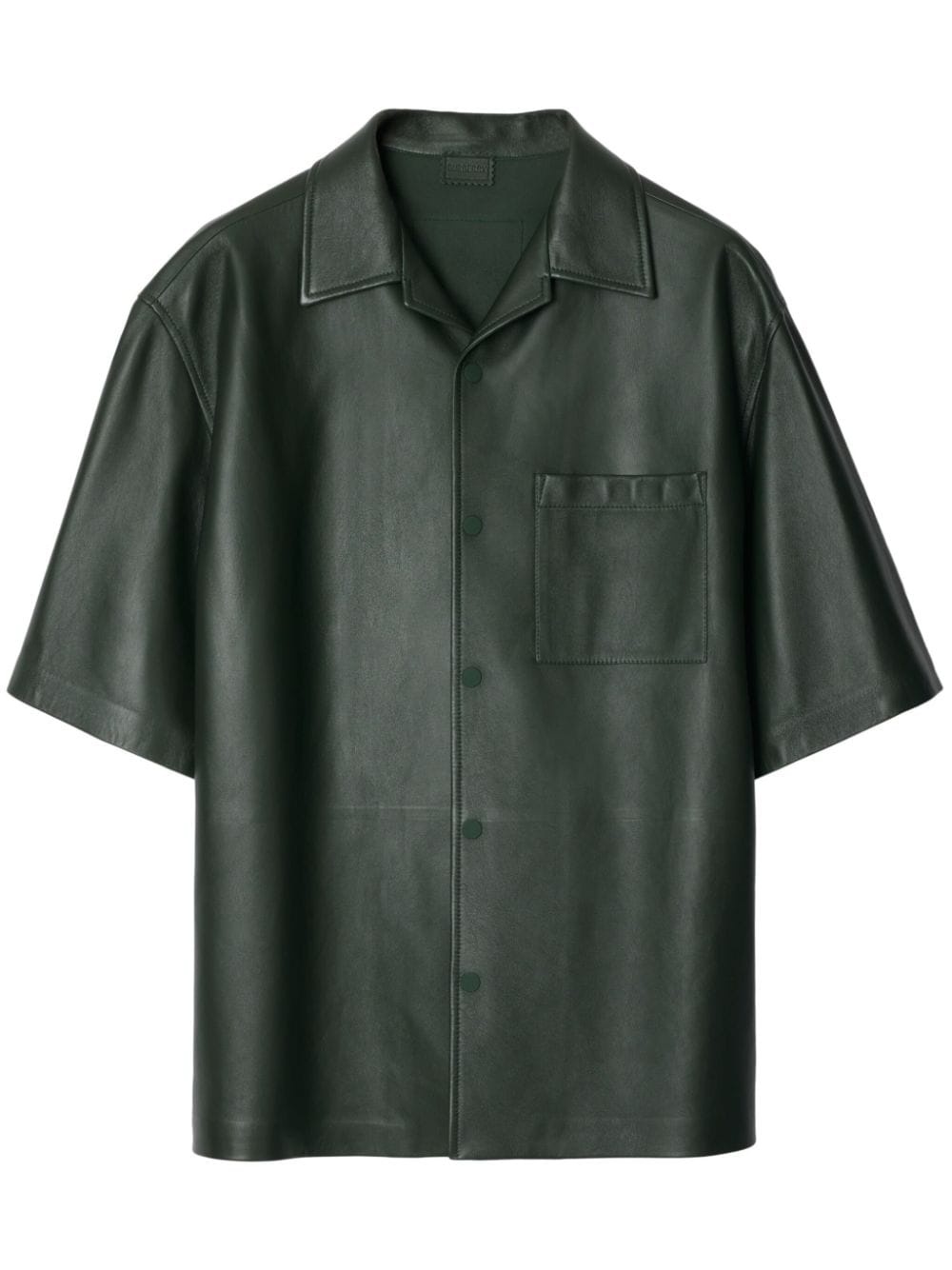 leather shirt Highlights - Forest green - Leather - Smooth grain - Front press-stud fastening - Camp collar - Drop shoulder - Short sleeves - Chest patch pocket - Signature equestrian knight motif - Applique logo - Straight hem Made in Italy Composition Leather 100% Washing instructions Specialist Cleaning