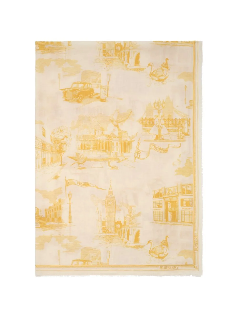 London Landmarks wool silk scarf Highlights - A lightweight scarf made in italy from wool silk. the design is printed with hand-drawn artwork depicting iconic london landmarks including the houses of parliament, tower bridge, trafalgar square and our horseferry house headquarters. - Rectangular - Eyelash fringing at edges - Printed burberry lettering at border Made in Italy Composition Wool 50%, Silk 50% SIZE & FIT Measurement LENGTH 76.77 in(195 cm) WIDTH 53.14 in(135 cm)