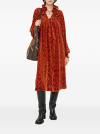 long-sleeve ruffled midi dress Highlights - Red - All-over pattern - Smocked neckline - Ruffled collar Made in Italy Composition Viscose 66%, Silk 34% Washing instructions Read Manufacturer Guidelines
