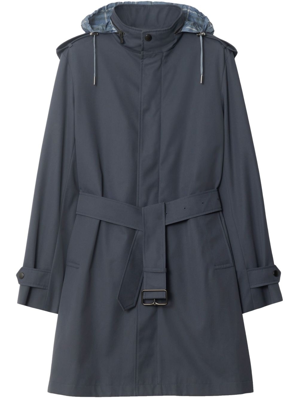mid-length trench coat Highlights - Grey - Drawstring hood - Check pattern - Concealed front zip fastening - Long sleeves Made in United Kingdom Composition Lining: Viscose 100%, Cotton 100% Outer: Cotton 100%, Polyamide 100%
