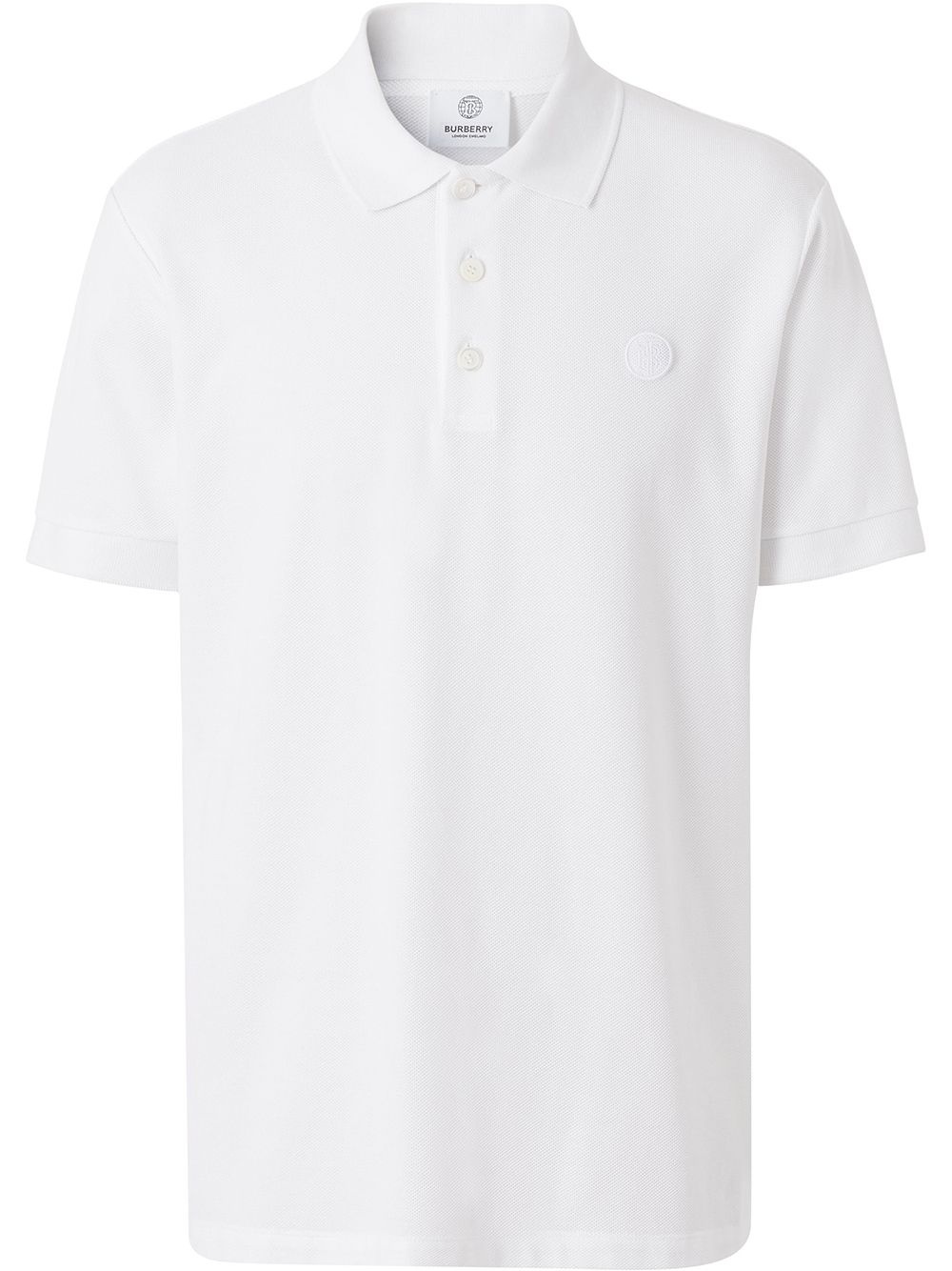 monogram-embroidered polo shirt Introduced in 2018, the TB monogram has graced Riccardo Tisci's collections from Burberry ever since. This white polo shirt has a sturdy pique construction and is embroidered with the logo detail on the chest in a tonal hue. Imported Composition Cotton 100% Washing instructions Machine Wash
