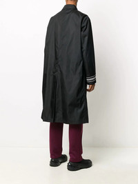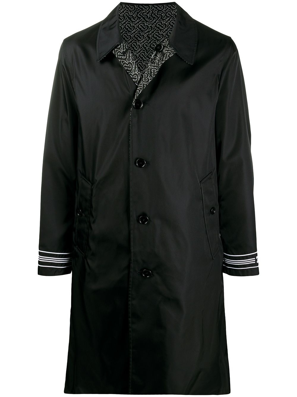 Monogram reversible trench coat Versatility is key. Turn this Monogram reversible trench coat from Burberry inside out if you're up for a change of scenery. Keep it interesting. Highlights - Black/grey - Reversible - Monogram print - Front button fastening - Two side button-fastening pockets - Mid-length - Slit detailing Imported Composition Outer: Polyamide 100% Lining: Polyamide 100% SIZE & FIT Model measurements Height 6 ft 2 in(1.87 m) Bust/Chest 38.18 in(97 cm) Hips 36.61 in(93 cm) Waist 29.13 in(74 cm) Measurement CHEST 48.42 in(123 cm) SLEEVE LENGTH 25.19 in(64 cm) Shoulder Width 18.89 in(48 cm) WAIST 51.18 in(130 cm) FittingInformation This piece fits true to size. We recommend you get your regular size Cut for a loose fit Made with a mid-weight non-stretch fabric Washing instructions Dry Clean Only