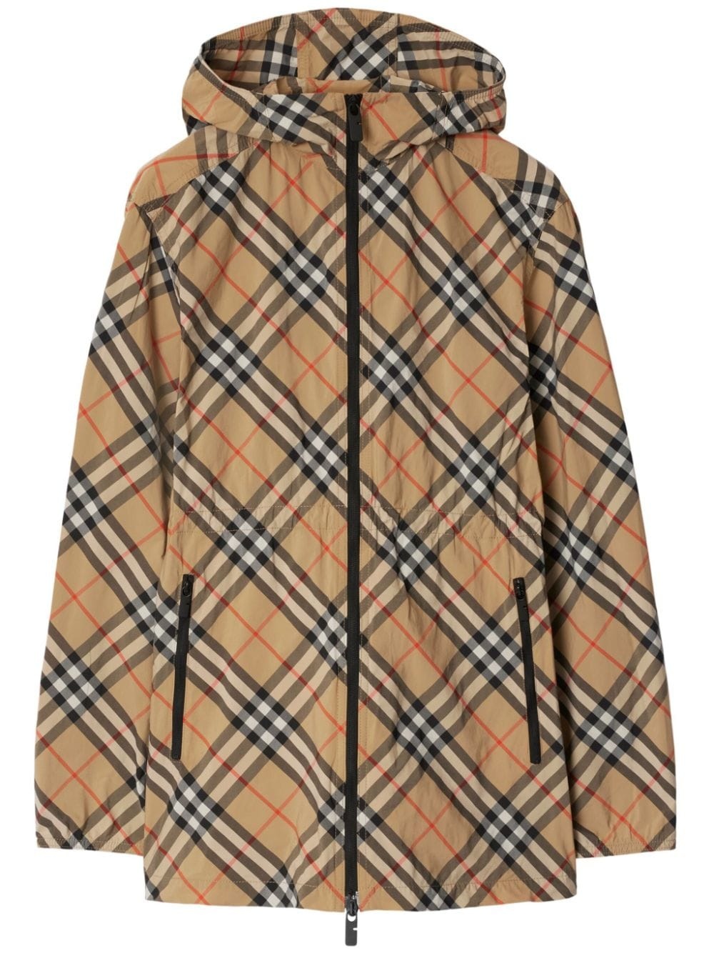Nova Check hooded coat Highlights - Archive beige - Multicolour - Nova check print - Signature equestrian knight motif - Classic hood - Front two-way zip fastening - Long sleeves - Two side zip-fastening pockets - Straight hem Imported Composition Outer: Polyamide 100% Lining: Polyamide 100%