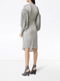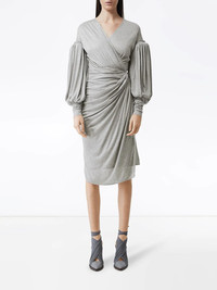 puff sleeve wrap dress Weekend comfort meets workday style in this Burberry wrap dress. Crafted from cosy jersey injected with a luxurous dash of mulberry silk, the grey design is given a boost through puff sleeves and a gathered waist. Meeting adjourned. Highlights - Grey - Mulberry silk-blend - Gathered detailing - Long puff sleeves - Wrap-around style - V-neck Made in Italy Composition Calf Leather 100%, Viscose 84%, Mulberry Silk 16% Washing instructions Dry Clean Only