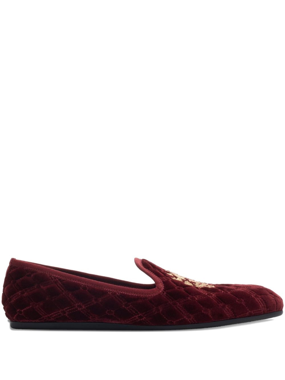quilted crest-embellished loafers Highlights - Burgundy - Quilted velvet - Crest embroidery - Almond-shaped toe - Equestrian-knight sole Made in Italy Composition Sole: Rubber 100% Outer: Calf Suede 100% Lining: Calf Leather 100%