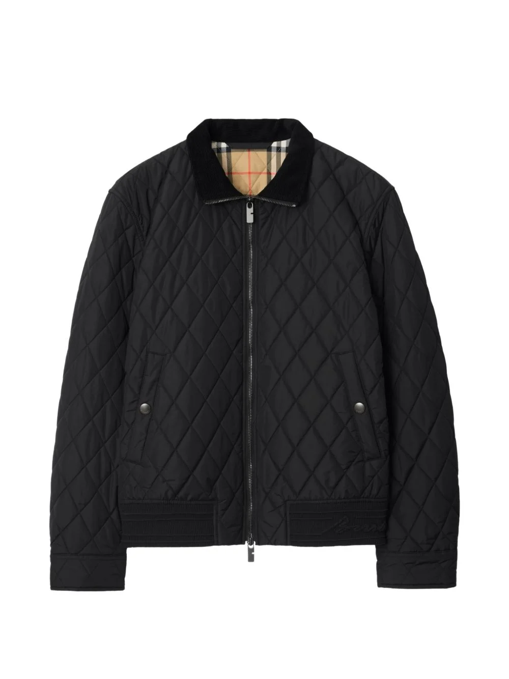 quilted nylon jacket Highlights - A quilted jacket in lightweight nylon, topped with a tonal corduroy collar and lined in burberry check cotton twill. cut to a relaxed fit, the style is jacquard-knitted with our cursive logo at the hem and finished with b-cut zip pulls. - Two-way zip closure - Side press-stud welt pockets - Rib-knit hem - Adjustable press-stud cuffs - Knitted burberry lettering at hem - Burberry check lining - Comes with a garment bag Imported Composition Outer: Polyamide 100%, Cotton 100%, Polyester 98%, Elastane 2% Lining: Cotton 100% Washing instructions Read Manufacturer Guidelines