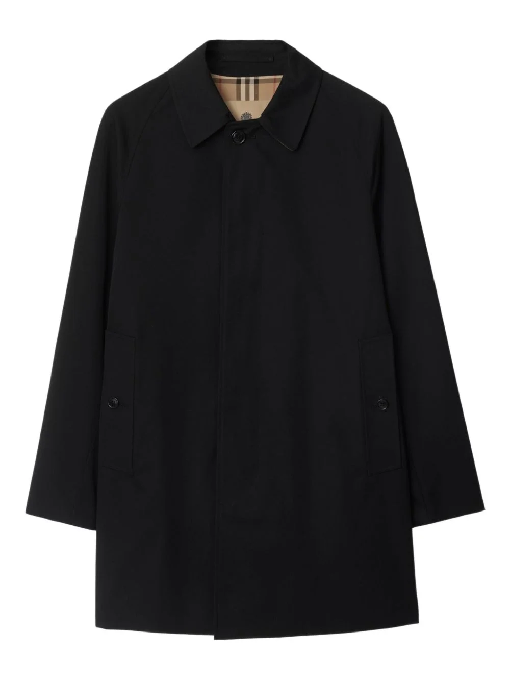 raglan-sleeve button trench coat Highlights - Black - Button closure - Button welt pockets - Button-tab cuffs - Back vent - Check undercollar Made in United Kingdom Composition Lining: Cotton 100%, Viscose 100% Outer: Cotton 100% Washing instructions Read Manufacturer Guidelines