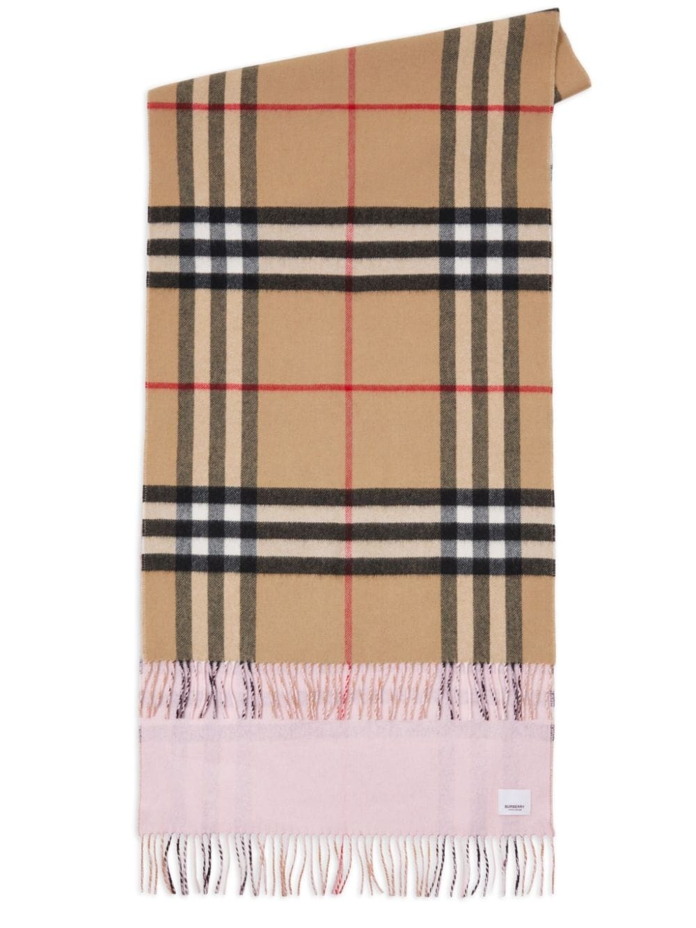 reversible check cashmere scarf Want to switch up your look in an instant? With this reversible check cashmere scarf from Burberry, it's a breeze. If only everything in life was so simple... Highlights - Pale pink/tan beige/black - Cashmere - Check pattern - Reversible - Fringe detailing Made in United Kingdom Composition Cashmere 100% SIZE & FIT Measurement LENGTH 82.67 in(210 cm) WIDTH 19.68 in(50 cm) Washing instructions Dry Clean Only
