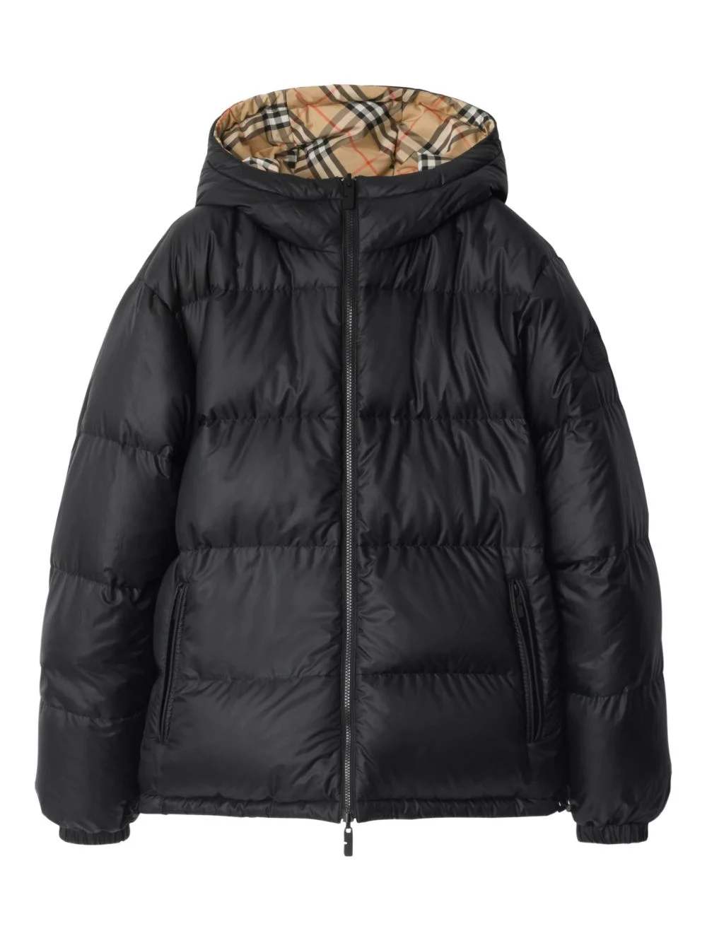 reversible check puffer jacket Highlights - Black - Hooded - Two-way zip-closure - Drawcord hood hem - Side-zip pockets - Knight stamp applique - Check-pattern reverse Imported Composition Fabric 100% Washing instructions Read Manufacturer Guidelines