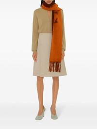 reversible fringed scarf Highlights - Carrot orange/dark red - Alpaca wool-blend - Reversible - Logo lettering - Fringed edge - Long length Made in Italy Composition Alpaca Wool 50%, Wool 28%, Yamamoto Neoprene 22% SIZE & FIT Measurement LENGTH 72.83 in(185 cm) WIDTH 8.26 in(21 cm)