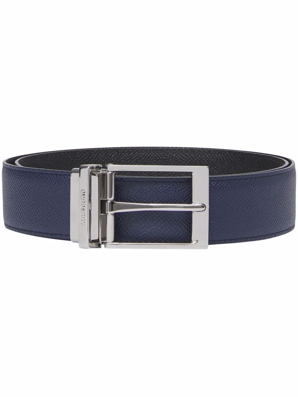 reversible grainy leather belt Crafted from grained leather, this reversible belt presents the choice of a navy blue or black exterior. The accessory is finished with a logo-engraved silver-tone buckle. Highlights - Navy blue/black - Calf leather - Grained texture - Reversible - Silver-tone buckle fastening - Adjustable fit Made in Italy Composition Outer: Calf Leather 100% SIZE & FIT Measurement Maximum Length 40.94 in(104 cm) Minimum Length 37.79 in(96 cm) WIDTH 1.18 in(3 cm)