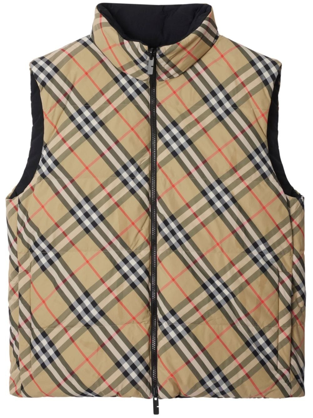 reversible padded gilet Highlights - Beige - Goose down - Reversible - Check print - High neck - Front zip fastening - Sleeveless - Straight hem Imported Composition Outer: Polyamide 100% Lining: Polyester 100%, Goose Down 90%, Goose Feather 10% Washing instructions Machine Wash