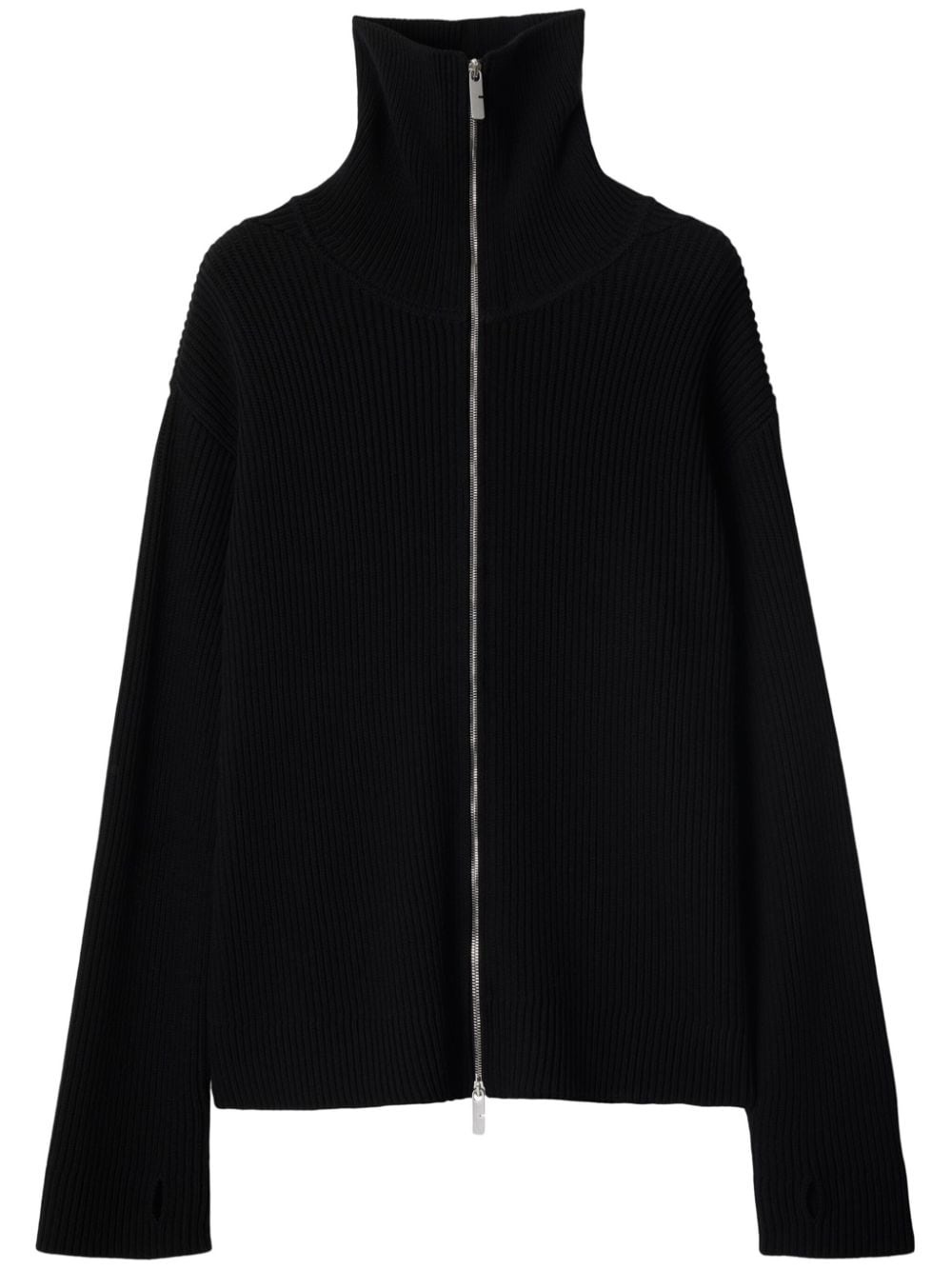 ribbed-knit cardigan Highlights - Black - Wool blend - Ribbed knit - Roll neck - Front two-way zip fastening - Drop shoulder - Long sleeves - Straight hem Made in Italy Composition Wool 90%, Polyester 10% Washing instructions Dry Clean Only