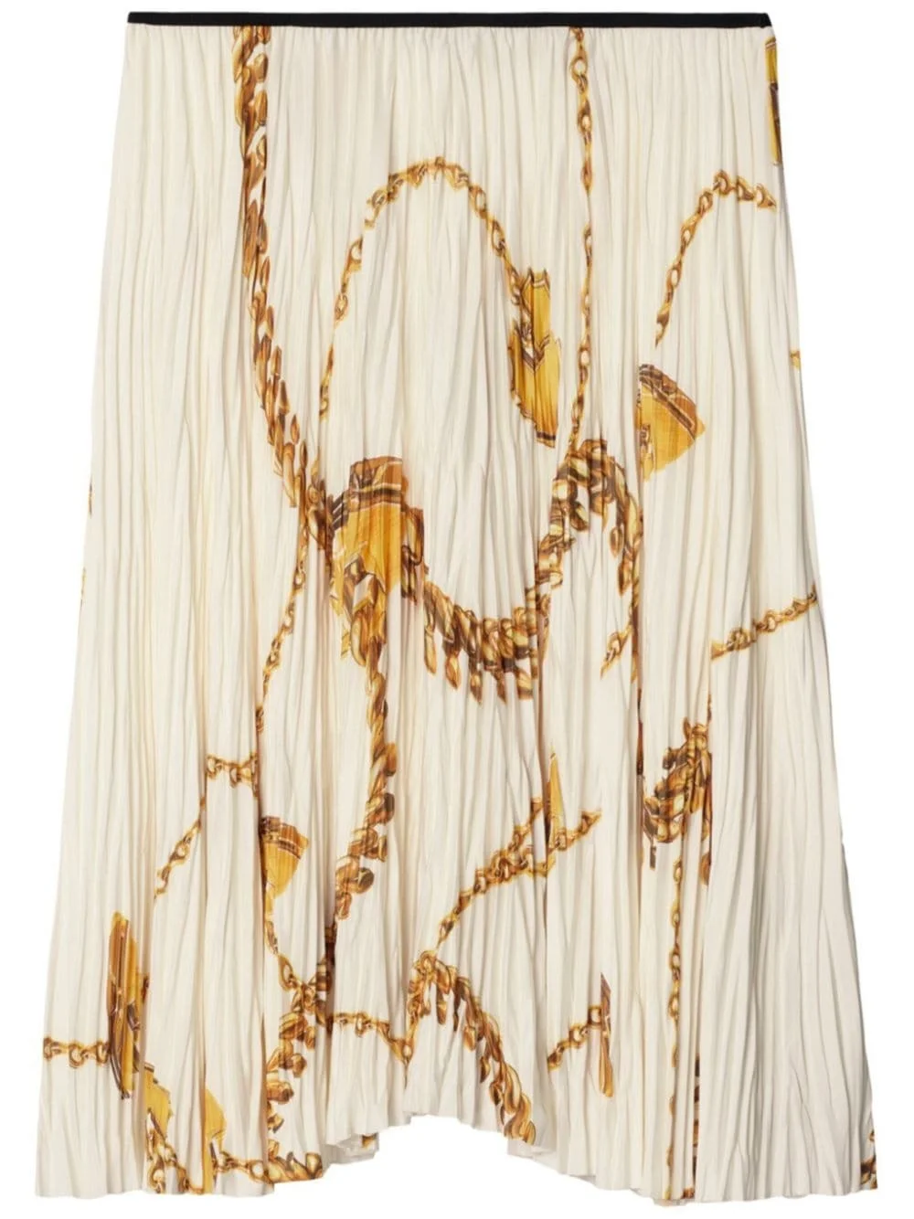 shield hardware jersey skirt Highlights - White - Gold-tone - Fully pleated - Hand-painted design - Shield hardware print - Asymmetric hem - Grosgrain ribbon trim Made in Italy Composition Polyester 100%