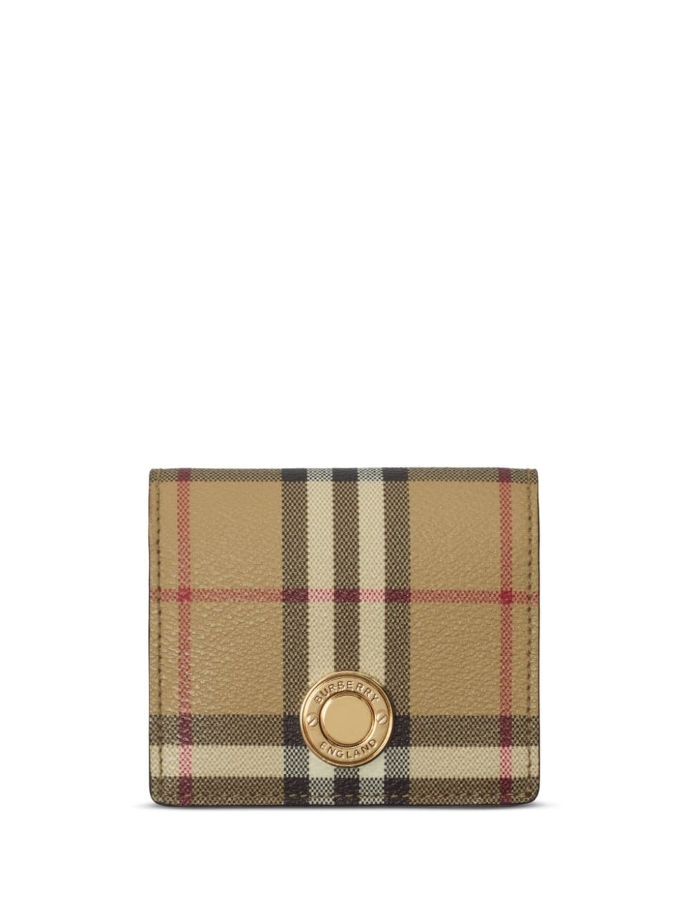 small Vintage Check wallet Highlights - Calf leather - Gold-tone logo plaque - Vintage check pattern - Embossed internal logo - Bi-fold design - Concealed front press-stud fastening - Internal card slots Imported Composition Outer: Polyurethane 55%, Polyester 25%, Cotton 20% Lining: Polyamide 100%, Viscose 100%, Calf Leather 100% SIZE & FIT Measurement DEPTH 1.18 in(3 cm) HEIGHT 3.34 in(8.5 cm) WIDTH 3.93 in(10 cm)