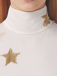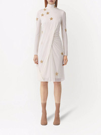 Silk viscose dress with gold stars Made in Italy, this knee-length dress from Burberry has star quality. Designed with a high neck, the long-sleeve design is embroidered with star motifs and has a draped panel on the front for a textured look. Highlights - Ivory white/gold-tone - Star print - All-over motif embroidery - Draped detailing - High neck - Concealed rear zip fastening - Long sleeves - Knee-length Made in Italy Composition Viscose 77%, Polyester 23% SIZE & FIT Measurement HIPS 34.64 in(88 cm) LENGTH 40.94 in(104 cm) WAIST 29.92 in(76 cm) Washing instructions Dry Clean Only