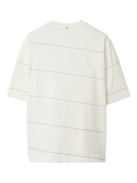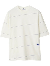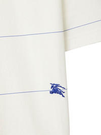 striped cotton T-shirt Crafted from cotton, this striped T-shirt pays homage to the Burberry's DNA. Note the Equestrian Knight Design embroidered on the front: the brand's first logo designed in 1901 that represents ' honour, the shield protection and the lance reform'. Highlights - White/blue - Cotton - Stripe print - Signature equestrian knight motif - Round neck - Short sleeves - Straight hem Made in Italy Composition Cotton 100%