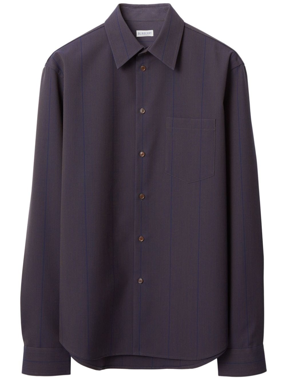 striped wool shirt Burberry’s Daniel Lee refreshes the house’s classic tailoring codes in subtle ways with pieces like this shirt. It’s cut to an oversized profile from dark-purple wool woven with a mix of ‘Knight-blue’ and herringbone stripes for a clash of pattern. Highlights - Barrel purple - Wool - Patterned jacquard - Front button fastening - Classic collar - Long sleeves - Buttoned cuffs - Chest patch pocket - Curved hem - Mother-of-pearl buttons Made in Italy Composition Mother of Pearl 100%, Wool 100%, Cotton 100%
