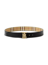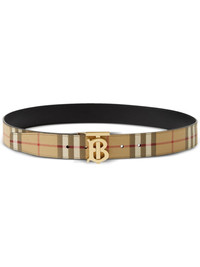 reversible check TB belt This belt is a versatile ode to the Burberry’s longstanding history – from the Vintage Check pattern to the TB buckle that pays homage to the founder’s initials. It flips around to a black leather reverse. Highlights - Archive beige/black - Canvas/leather - Reversible - Vintage check pattern - Signature tb monogram plaque - Pin-buckle fastening - Gold-tone hardware Made in Italy Composition Leather 100%, Gold Plated 100%, stainless steel 100%, Polyurethane 71%, Polyester 16%, Cotton 12%, Acrylic 1% SIZE & FIT Measurement CIRCUMFERENCE 35.43 in(90 cm) Maximum Length 35.43 in(90 cm) Minimum Length 33.46 in(85 cm) WIDTH 1.37 in(3.5 cm)