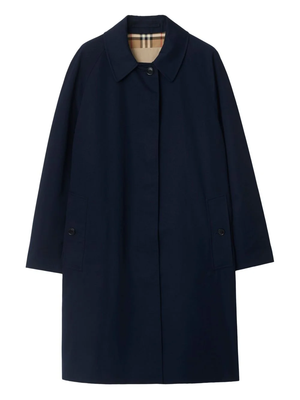 The Camden Heritage car coat Included in Burberry's AW22 collection in a deep navy colour, the Camden Heritage car coat has become one of the house's most recognisable silhouettes. Fastening at the front with a concealed placket, this outerwear design is lined with a Vintage Check print as a nod to the brand's heritage. Highlights - Midnight blue - Cotton - Classic collar - Concealed front button fastening - Belted cuffs - Vintage check-pattern lining - Central rear vent Made in United Kingdom Composition Outer: Organic Cotton 70%, Cotton 30% Lining: Cotton 100%, Viscose 100% Washing instructions Dry Clean Only