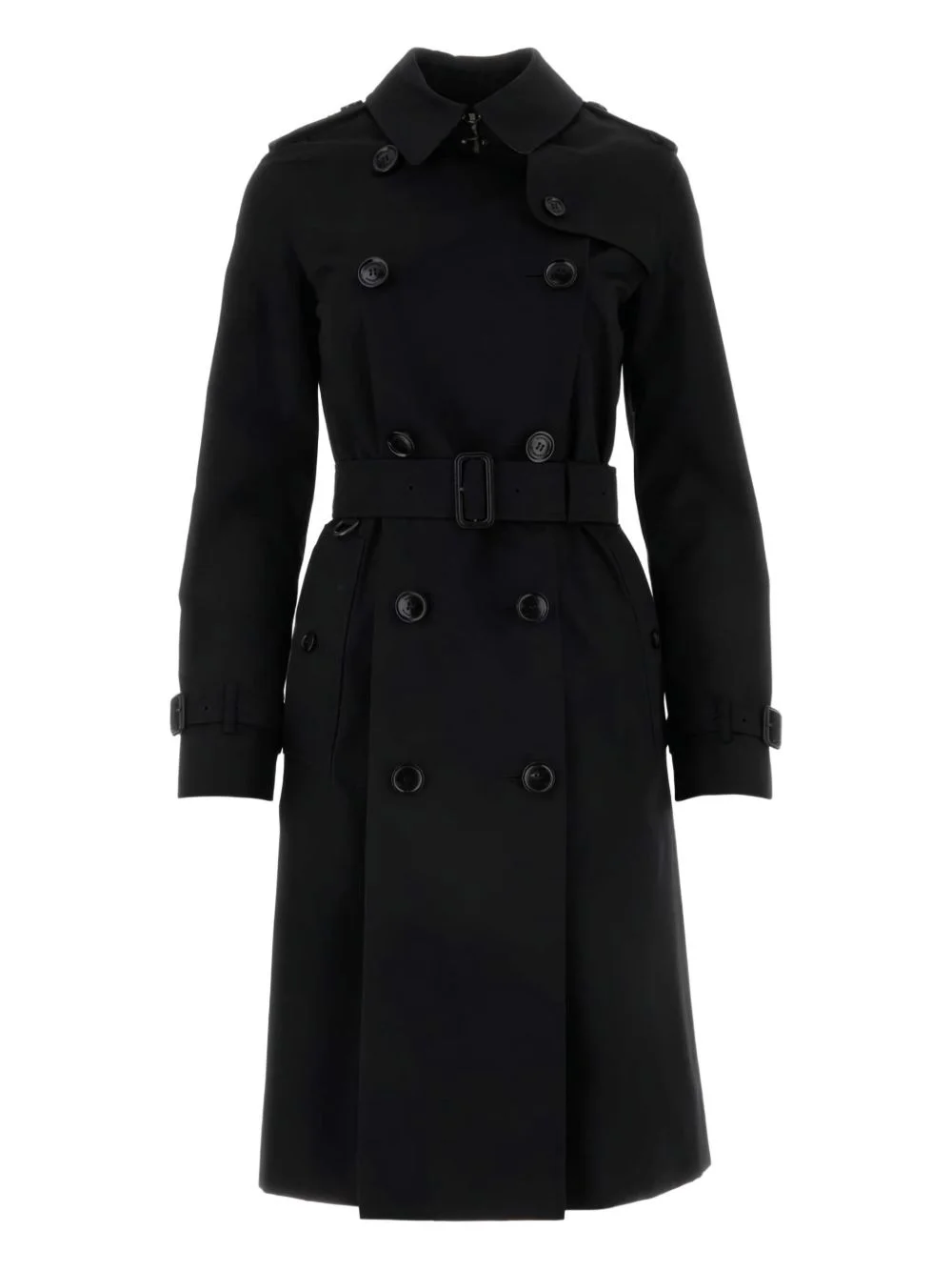 The Kensington trench coat Burberry is known for its exquisite portfolio of classic trench coats. A case in point, this style is crafted to a traditional double-breasted silhouette, accompanied by a belted waist and classic epaulettes. Highlights - Black - Organic cotton - Twill weave - Ring hardware detailing - Spread collar - Double-breasted button fastening - Epaulettes - Long sleeves - Belted cuffs - Rear cape insert - Two side welt pockets - Belt loops - Detachable waist belt - Central rear vent - Straight hem - Mid-length - Full lining Made in United Kingdom Composition Lining: Cotton 100%, Viscose 100% Outer: Cotton 100%, Calf Leather 100% SIZE & FIT FittingInformation Designed for a slim fit that sits just away from the body offering a close yet comfortable fit The belt offers adjustability for fitted preferences Made from a midweight non-stretch fabric This piece fits true to size – take your usual size