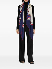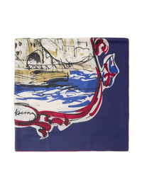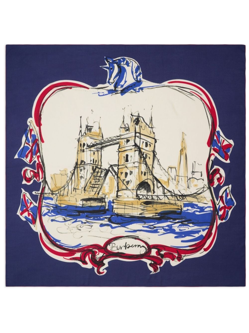 Tower Bridge scarf Highlights - Navy blue/multicolour - Cashmere-silk blend - Illustration-style print - Signature equestrian knight motif - Square shape Made in Italy Composition Cashmere 68%, Silk 32% SIZE & FIT Measurement LENGTH 55.11 in(140 cm) WIDTH 15.74 in(40 cm)
