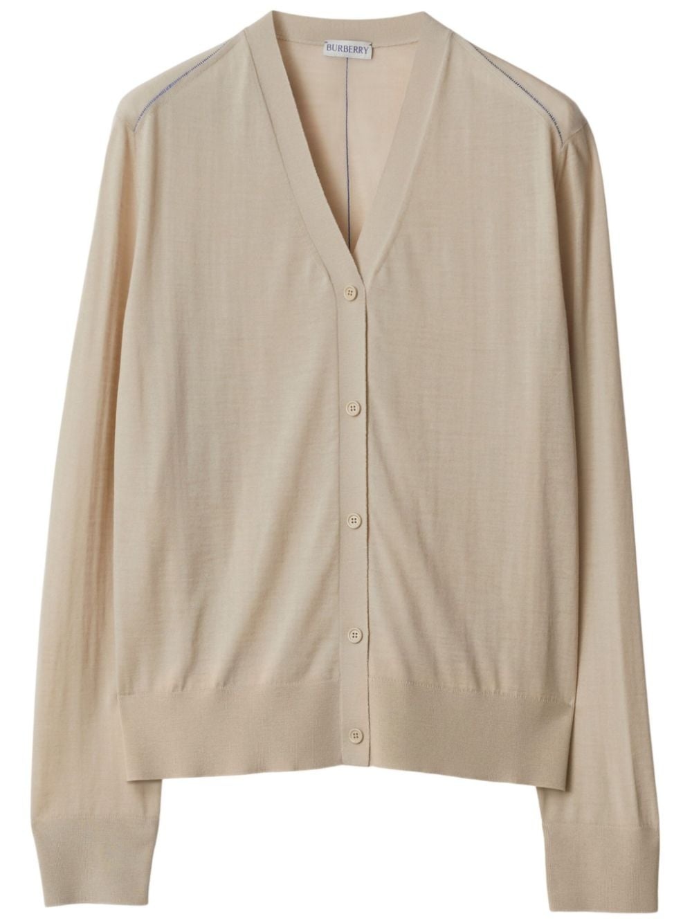 V-neck wool cardigan Highlights - Light beige - Wool - Fine knit - V-neck - Front button fastening - Long sleeves - Ribbed-knit edge Made in Italy Composition Wool 100%, Polyester 100%